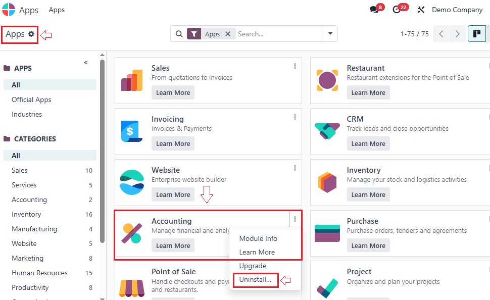 - Go to Apps → Search “Accounting” → Install or go with it if it's already installed.