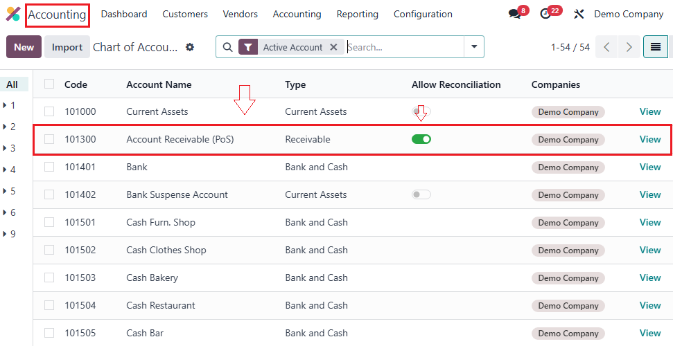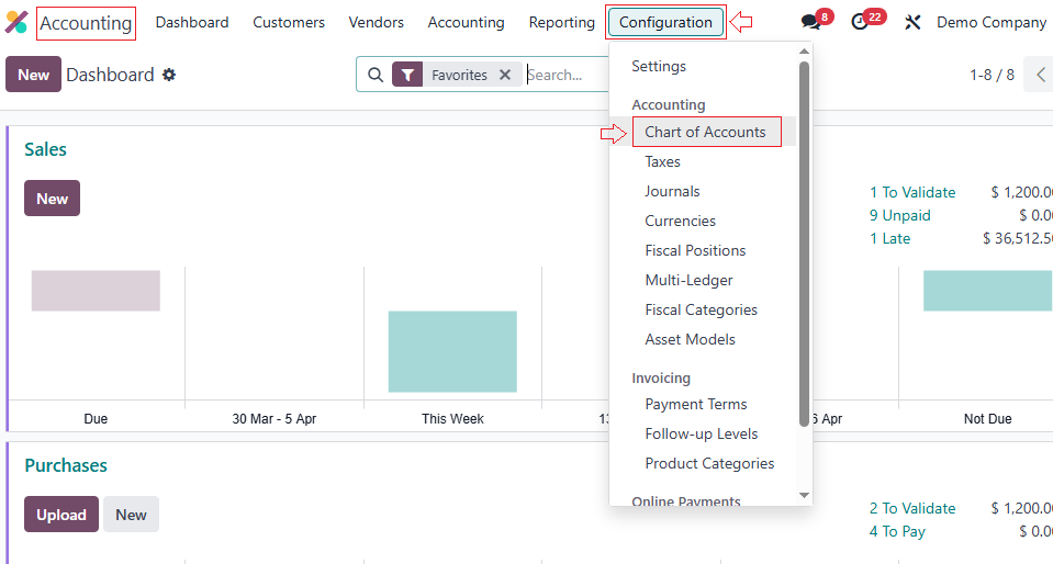 - Go to Accounting → Configuration → Chart of Accounts