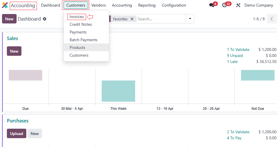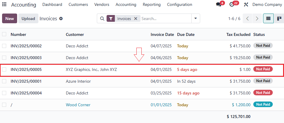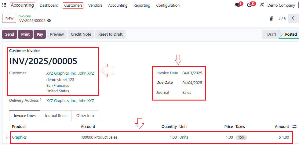 - Go to Accounting → Customers → Invoices → Create