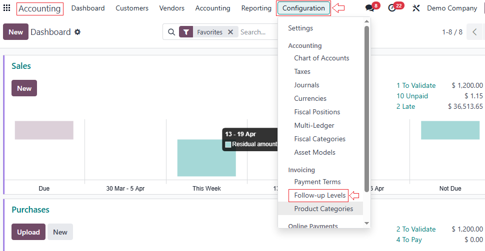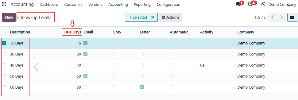 - Go to Accounting → Configuration → Follow-up Levels