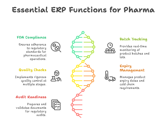 Pharma businesses operate under stringent global regulations. Your ERP must go beyond basic inventory—it should manage: