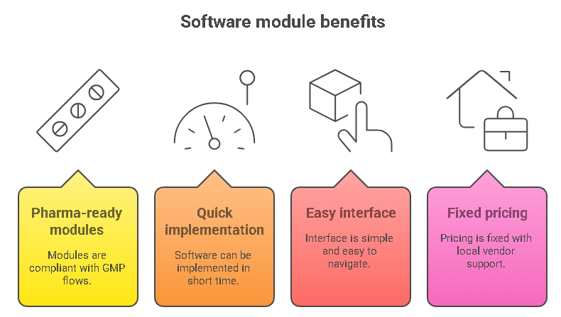 - Pharma-ready modules with standard GMP flows