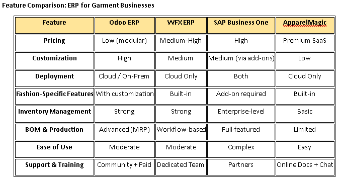 In this article, we compare four leading ERP solutions for garment businesses—Odoo, WFX, SAP Business One, and ApparelMagic—to help MSMEs, mid-size enterprises, and retail-oriented brands make informed decisions.