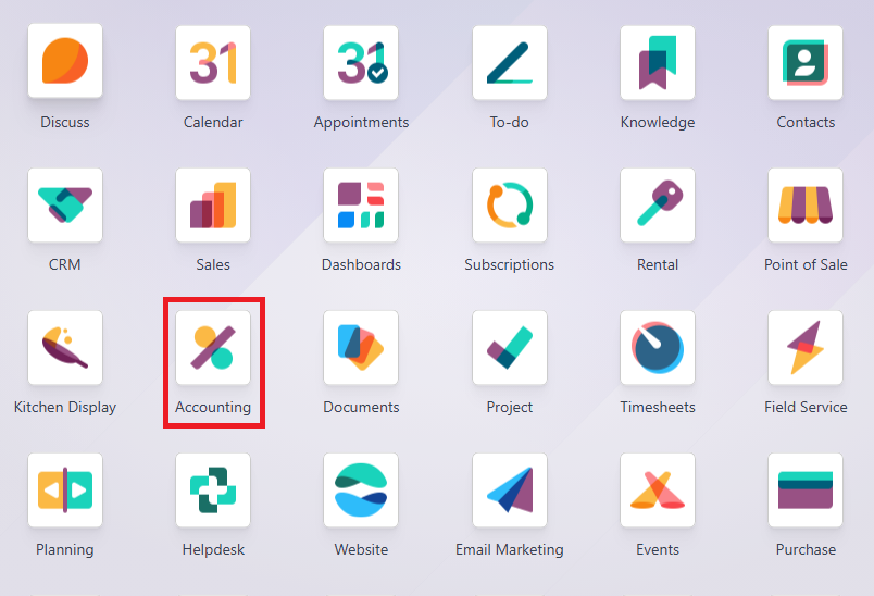- Go to Apps → Install the Accounting Module (if not already installed).