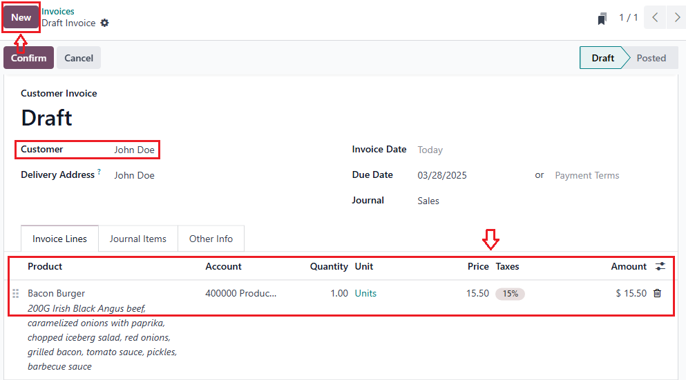 Odoo 17 automates GST calculations in invoices. To create a GST invoice: