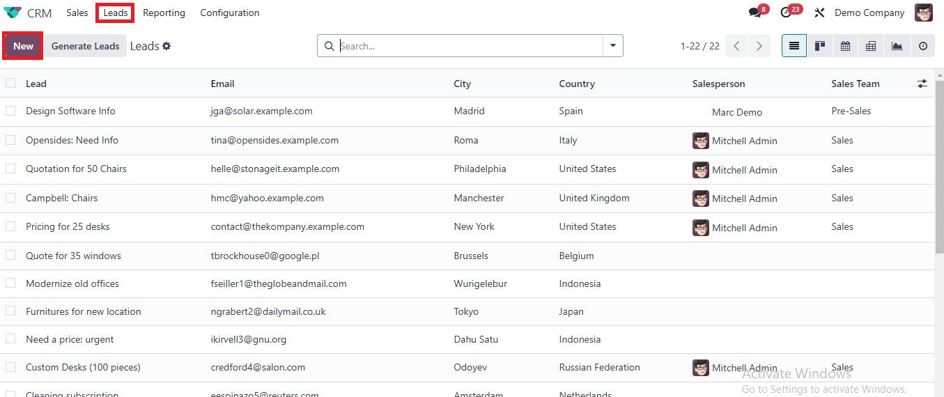 - Once inside the CRM module, click on Leads from the menu to access the existing lead list.